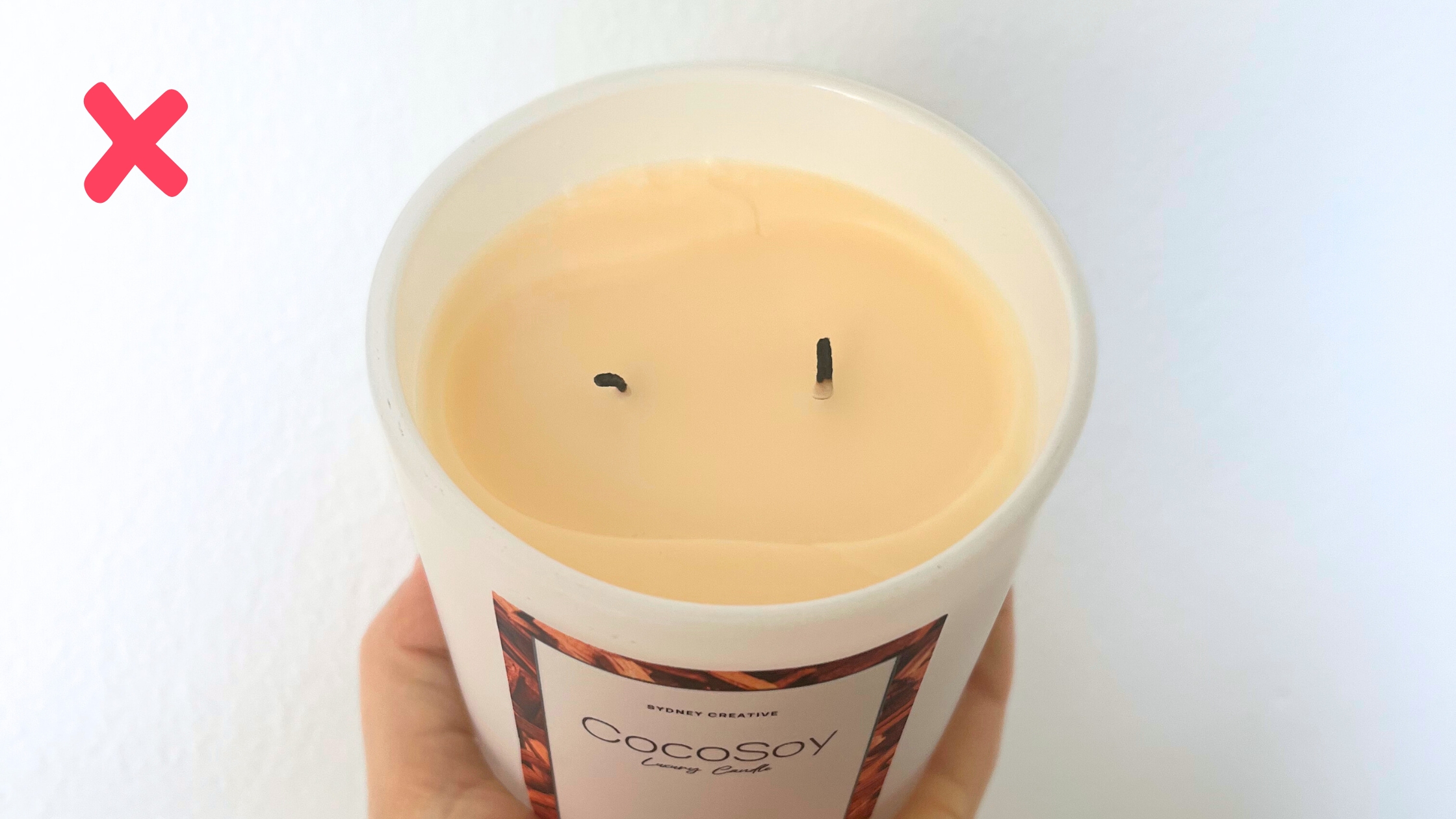 Below is a perfect example of how tunnelling starts. The wax didn’t melt all the way to the edges, which creates a narrow ring that gets deeper each time you light it. To avoid this, always burn your Sydney Creative candle for a full 4 hours the first time- or until the melt pool reaches right to the sides. A clean, even top now means better burns (and scent) later!