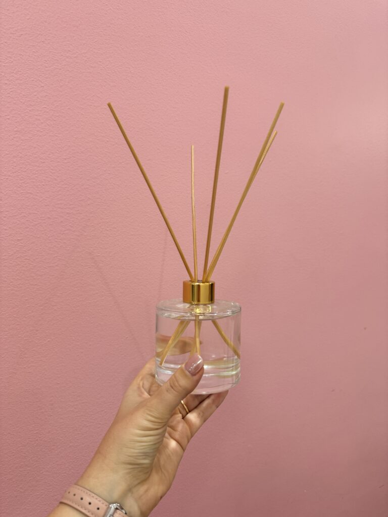 - All materials needed to create your reed diffuser, including the bottle, fragrance oils, lid and reed sticks.